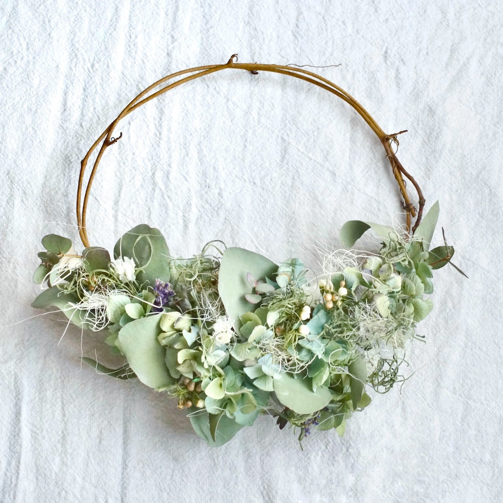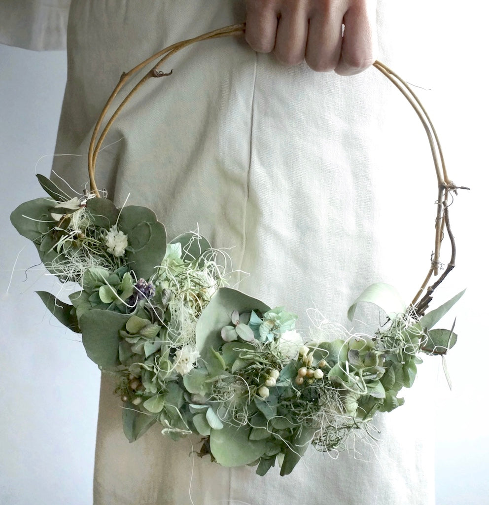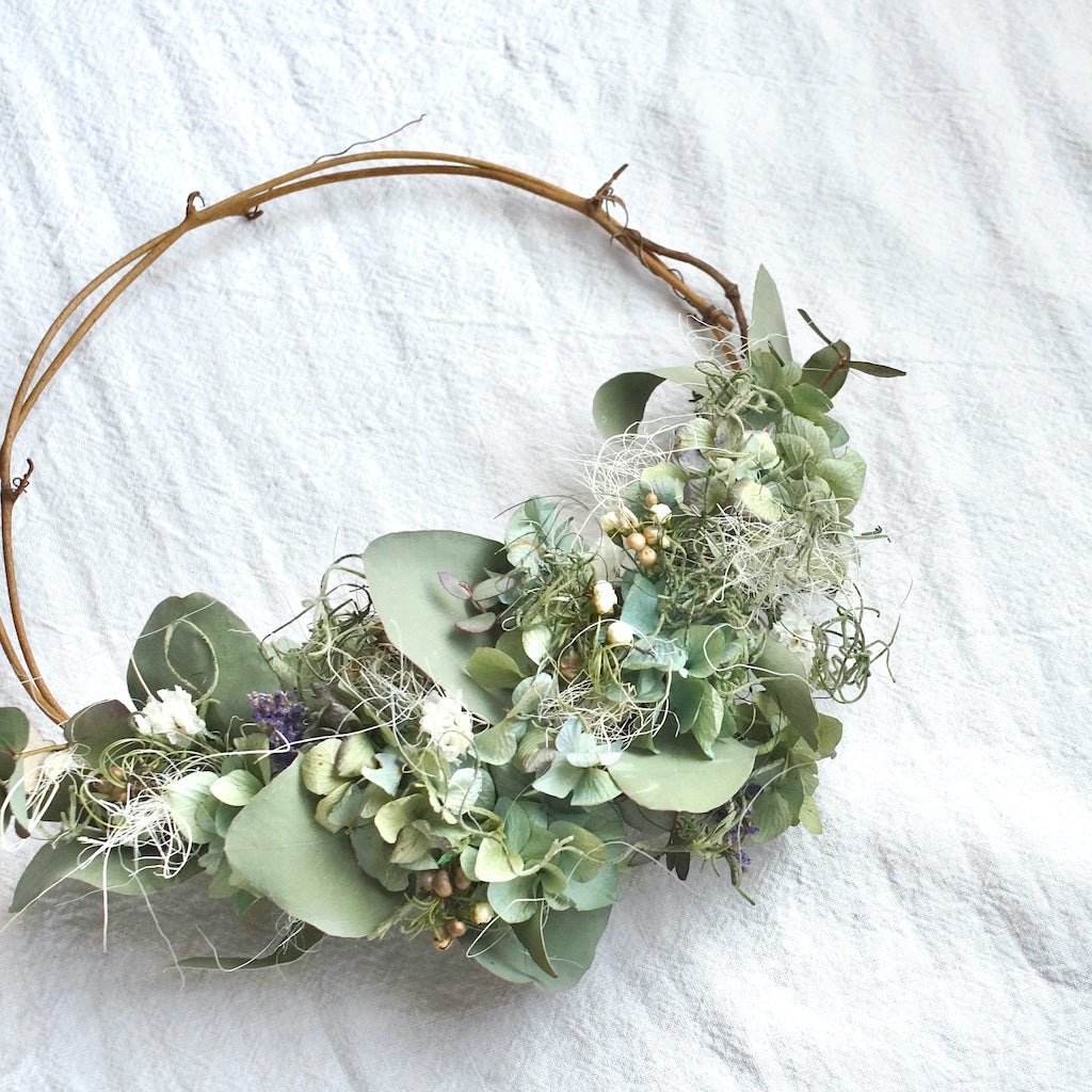 ブルーや紫の色合いが美しいドライフラワーの紫陽花を、ユーカリやスターチスで合わせたハーフリースです。