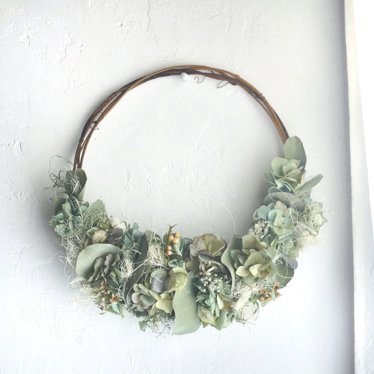 使用花材:アジサイ、ユーカリ、アンモビューム、スパニッシュモス他