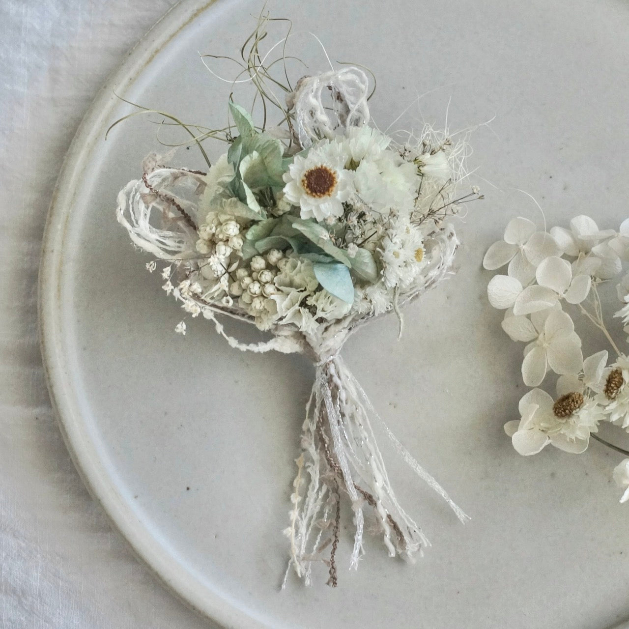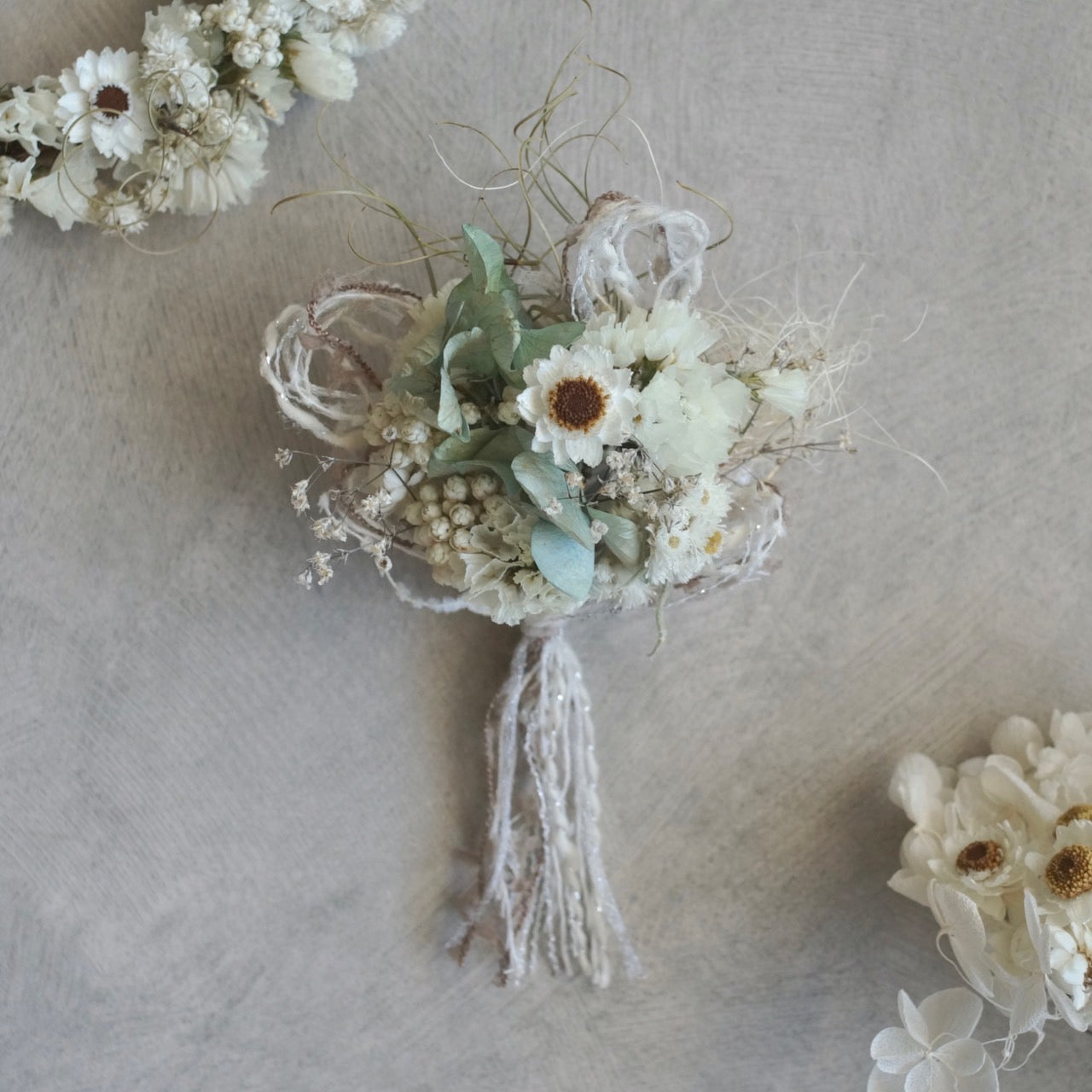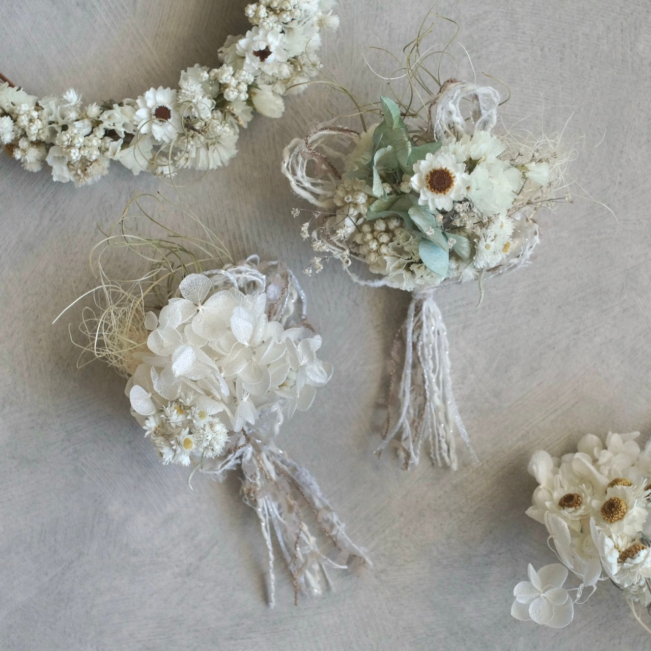 ライスフラワーやスターチス、カスミソウなど白い小花を合わせたドライフラワーのコサージュです。