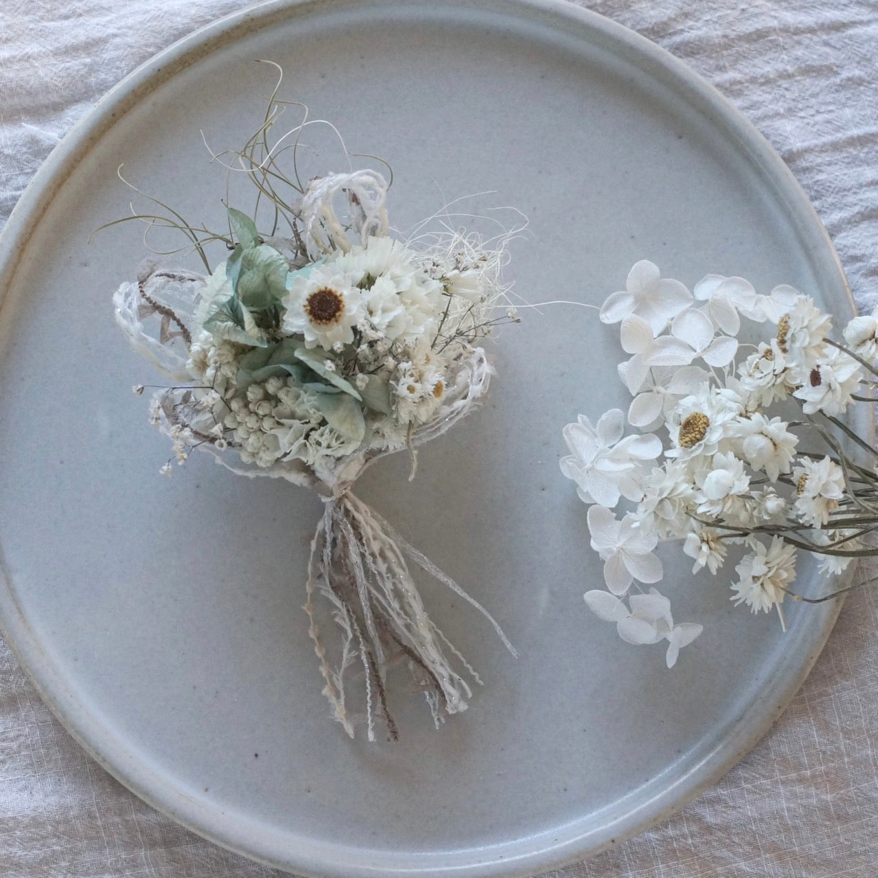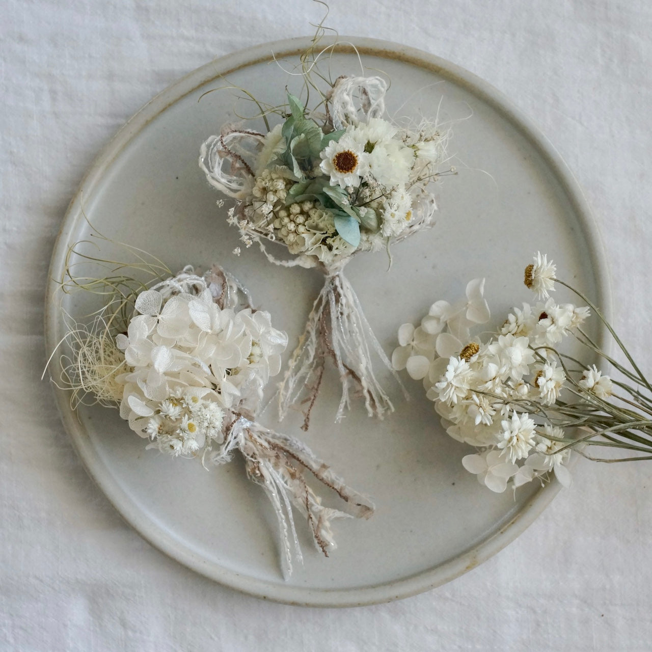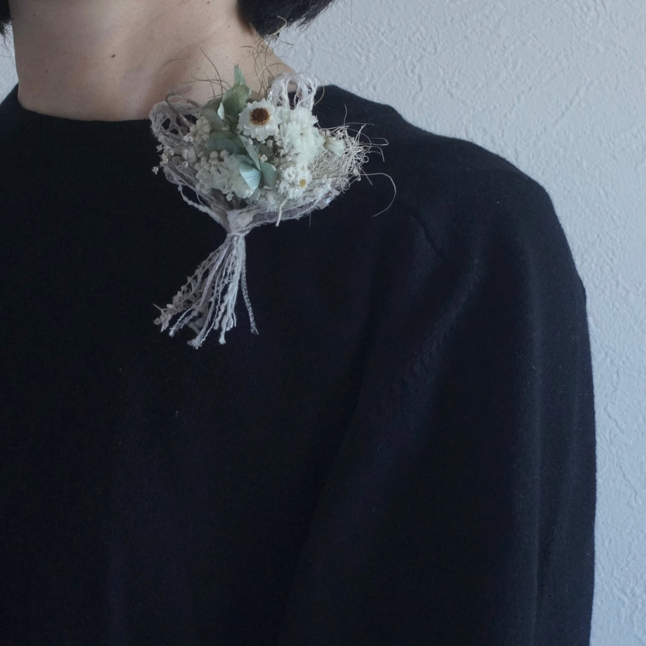 ライスフラワーやスターチス、カスミソウなど白い小花を合わせたドライフラワーのコサージュです。