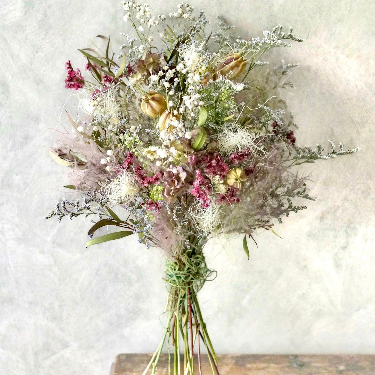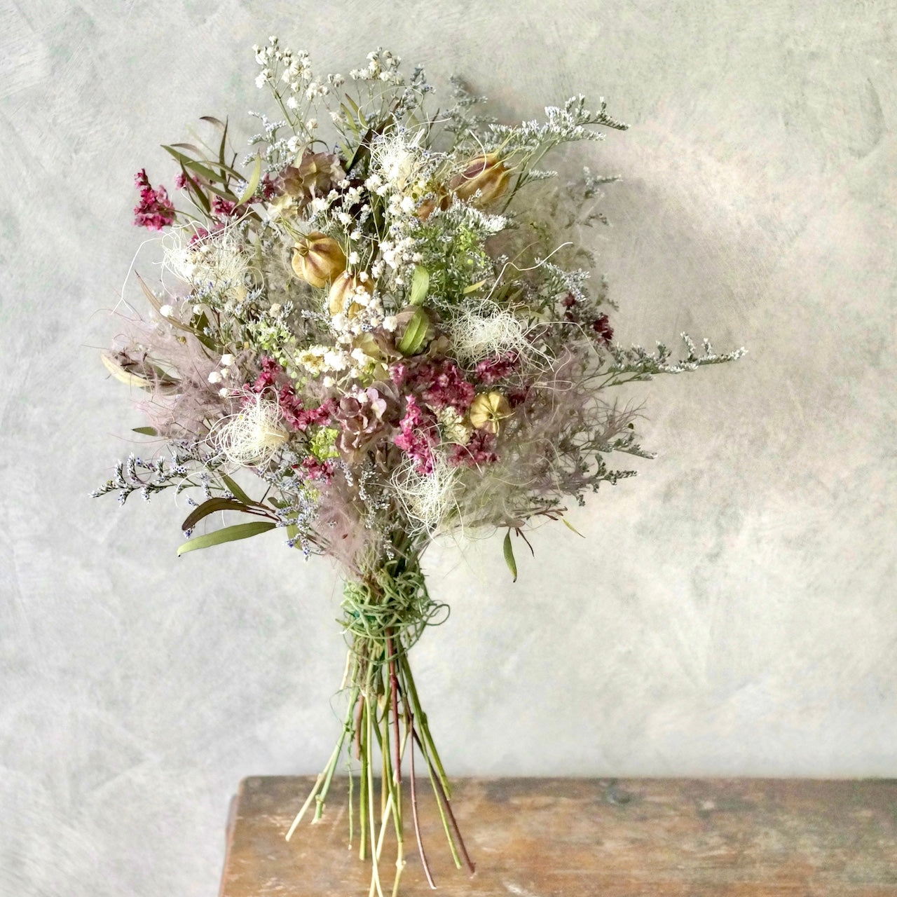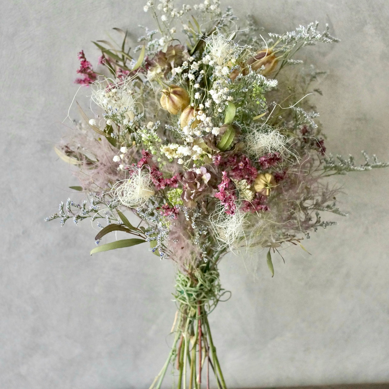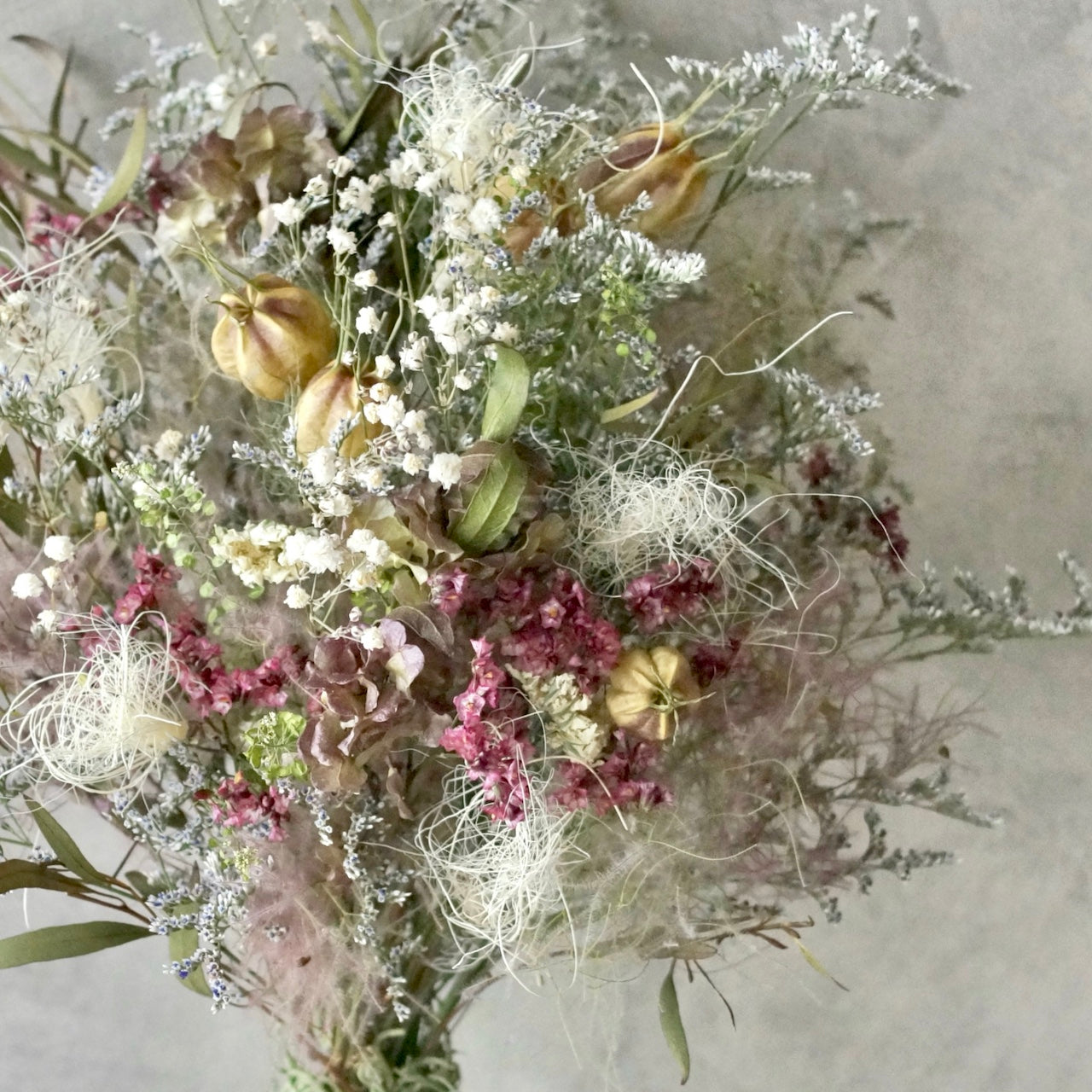 ピンクのスターチス、紫色のドドナエア、白いかすみ草など、小さく可憐な草花が色鮮やかに混ざり合った独自の世界観をお楽しみいただけます。