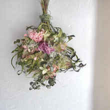 大きさは、程よいボリュームで飾りやすい30cmサイズです。10-15cmほどの深さのあるフラワーベースに収まる大きさです。そのまま立てかけても飾っていただけますし、吊り紐付きなので、スワッグとして、壁や扉に吊り下げてもお楽しみいただけます。