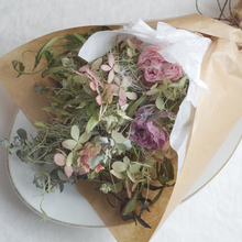 ラナンキュラスやバラ、ミナヅキなど淡い桃色の草花を合わせた優しい色合いのブーケです。