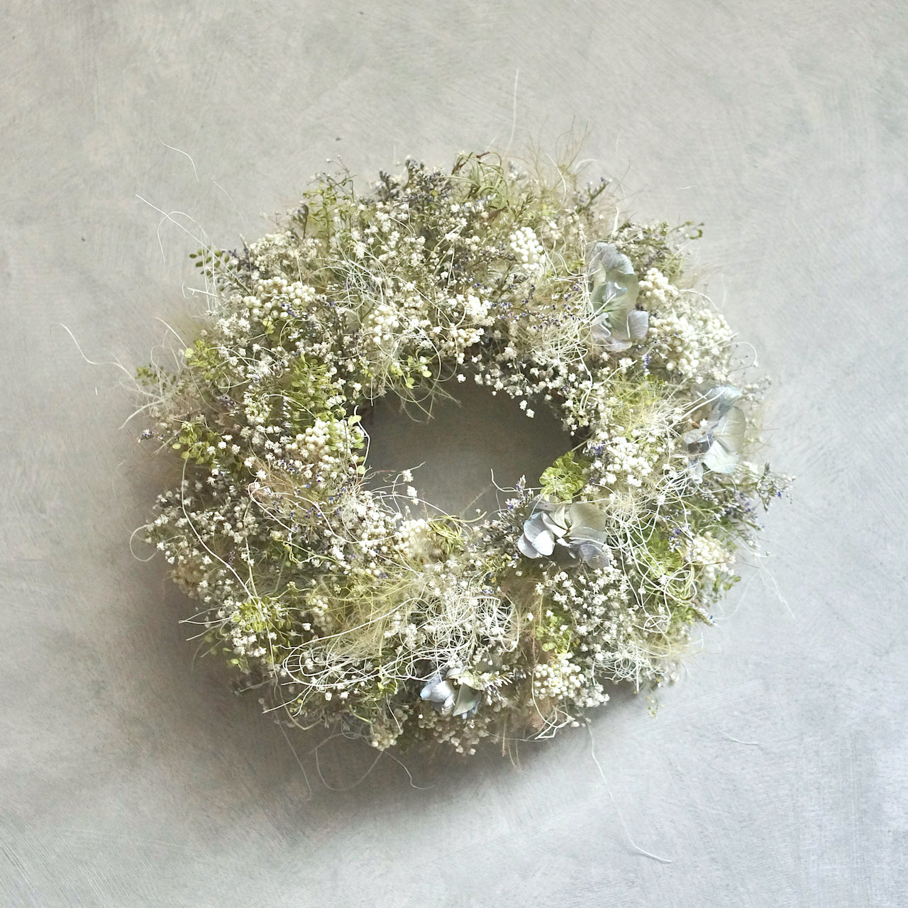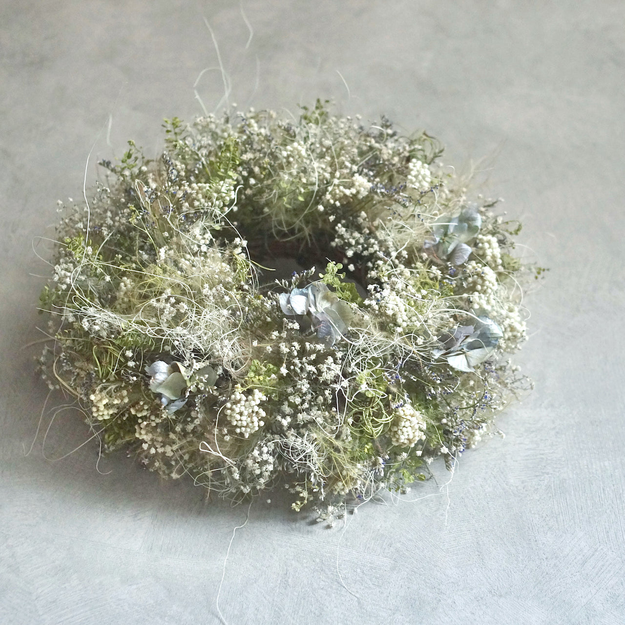 軽やかな空気をまとったスモークツリーのドライフラワーに、夏の草花を合わせたリースです。
